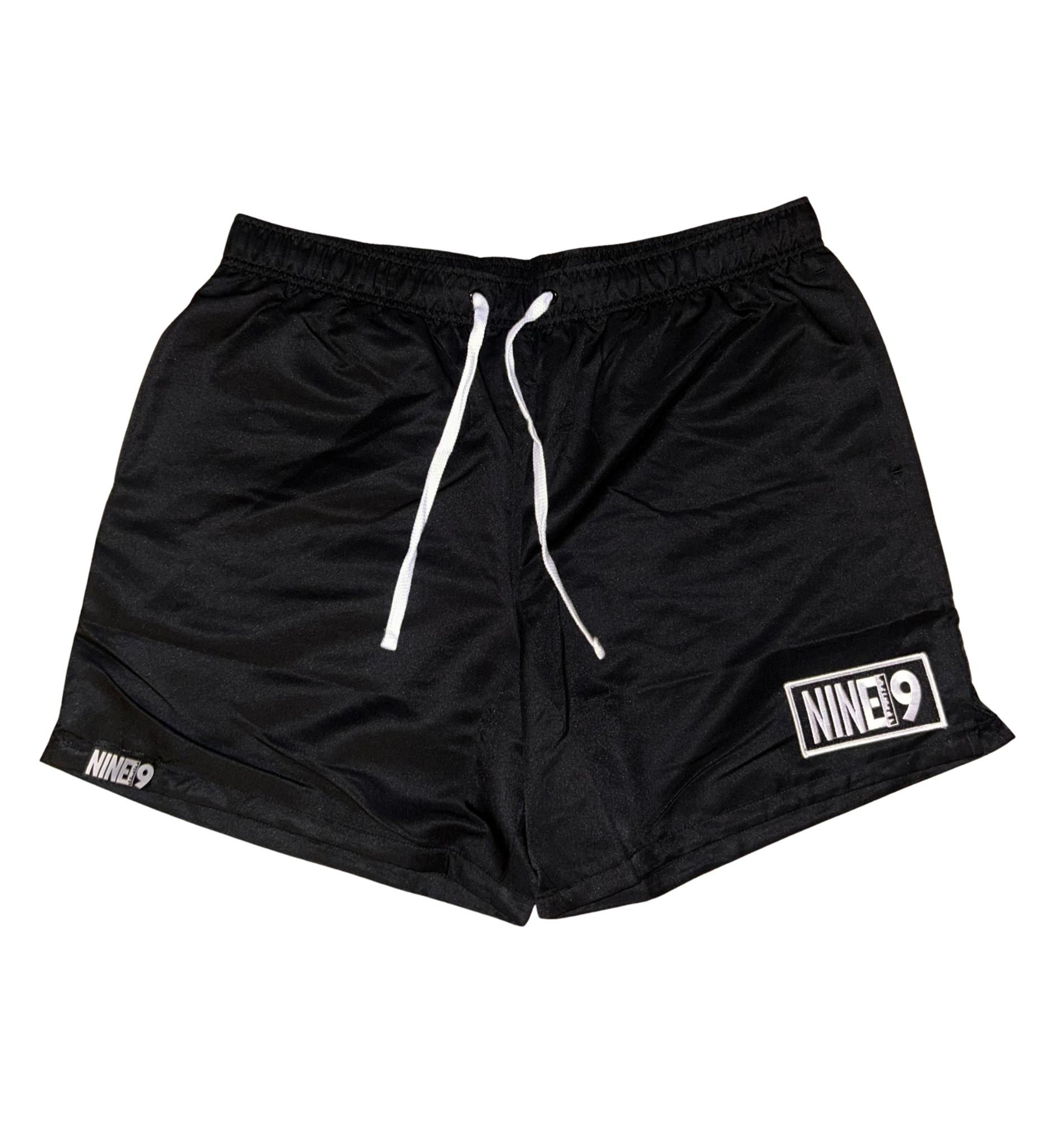 Black trunks with adjustable drawstring and NINE19 patch. Lightweight breathable, and perfect for workouts, lounging, and everyday streetwear.